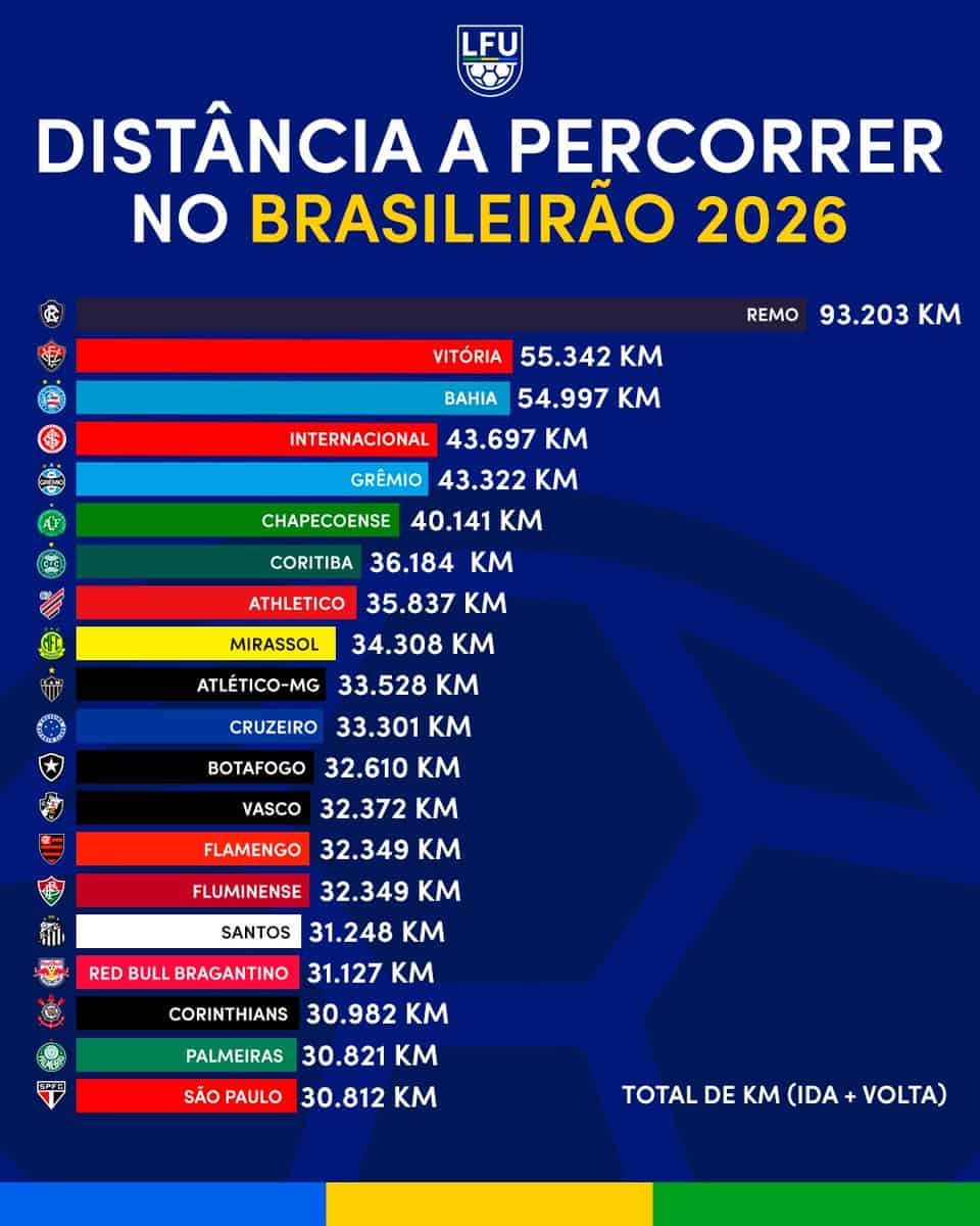 Veja o quanto cada time da Série A viajará ao longo do Campeonato Brasileiro de 2026.