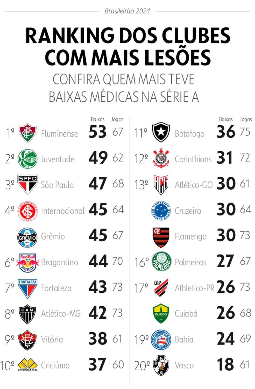 Athletico-PR, Cuiabá e Palmeiras também se destacaram, cada um com menos de 30 contusões no total. Confira abaixo a classificação dos times com mais baixas médicas em 2024: