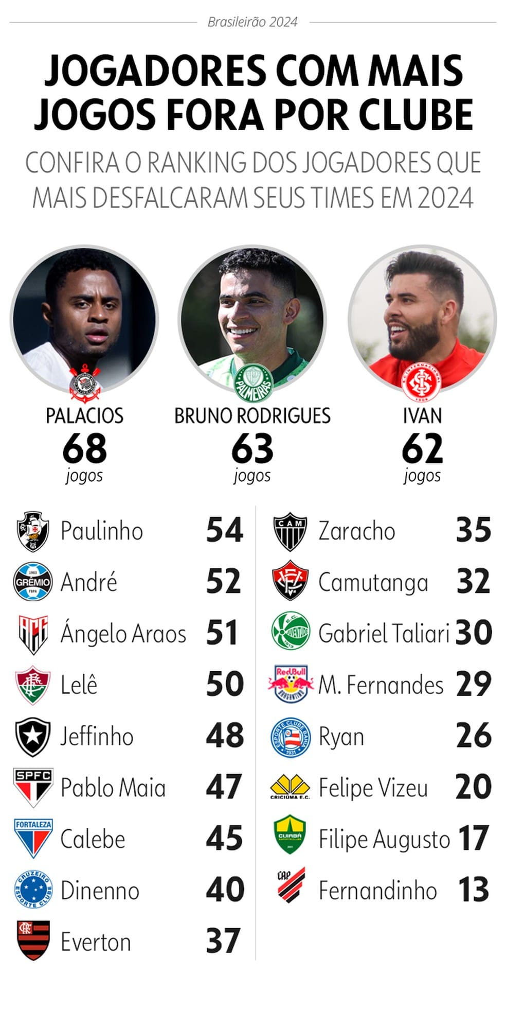 Jogadores que mais perderam mais jogos no ano por lesão em cada time da Série A em 2024 — Foto: Infoesporte