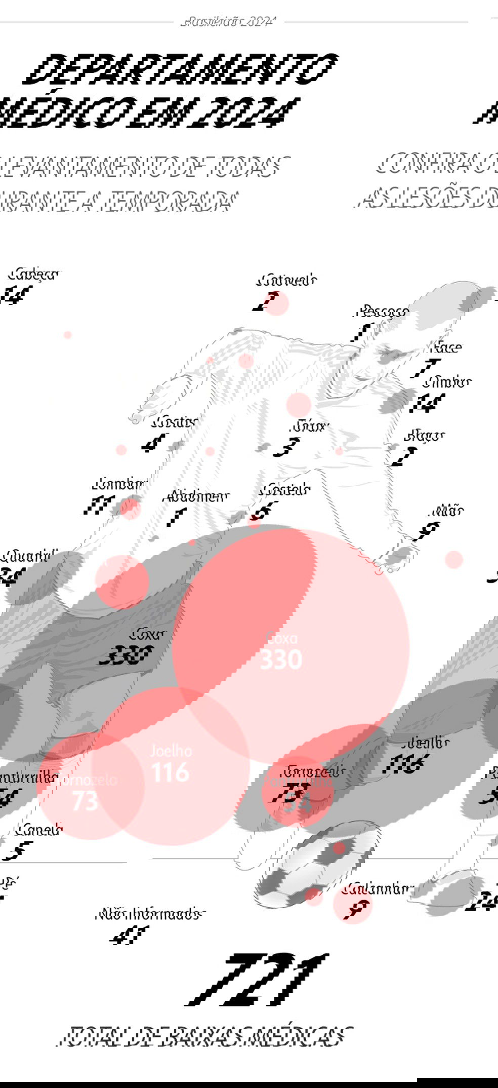No total, foram 330 lesões musculares na coxa em 2024. As lesões no joelho ficaram em segundo lugar, com 116 casos, dos quais 39 necessitaram de cirurgia. Lesões em tornozelos (73) e panturrilhas (54) também se destacaram neste ano. Confira o infográfico detalhado abaixo: