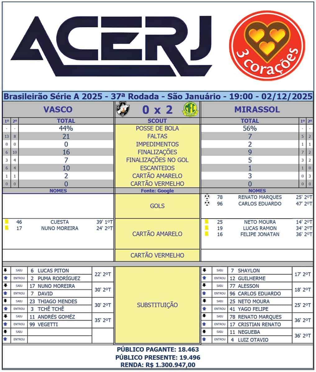 O jogo final entre Vasco e Mirassol ocorrerá na 37ª Rodada do Campeonato Brasileiro 2025, em São Januário (Fonte: Google). Fique por dentro das atualizações! #Acerjinforma #brasileirao2025 #VASxMIR #VascodaGama #MirassolFC @Brasileirao @VascodaGama @mirassolfc