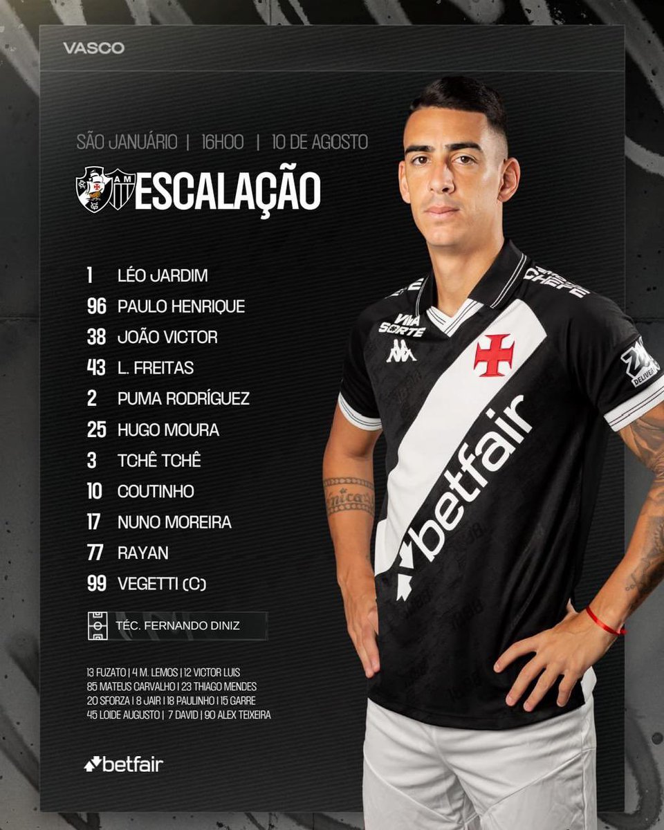 Conforme informado anteriormente, Pumita será o titular na lateral esquerda do Vasco na partida contra o Atlético-MG. Victor Luís, que é o lateral esquerdo habitual, ficará no banco, mesmo com Piton cumprindo suspensão.